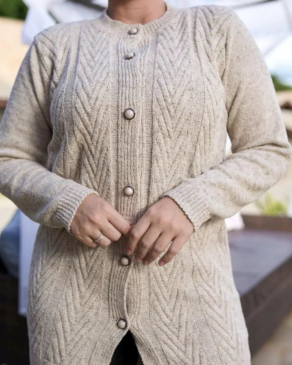O Casaco de Tricot Ponto V em Mousse com Abertura Frontal com Botões é uma peça que redefine o conceito de elegância cotidiana. Com uma abertura forntal detalhada por botões charmosos, este casaco é a combinação perfeita de funcionalidade e estilo, projetado para quem aprecia a beleza nos detalhes.